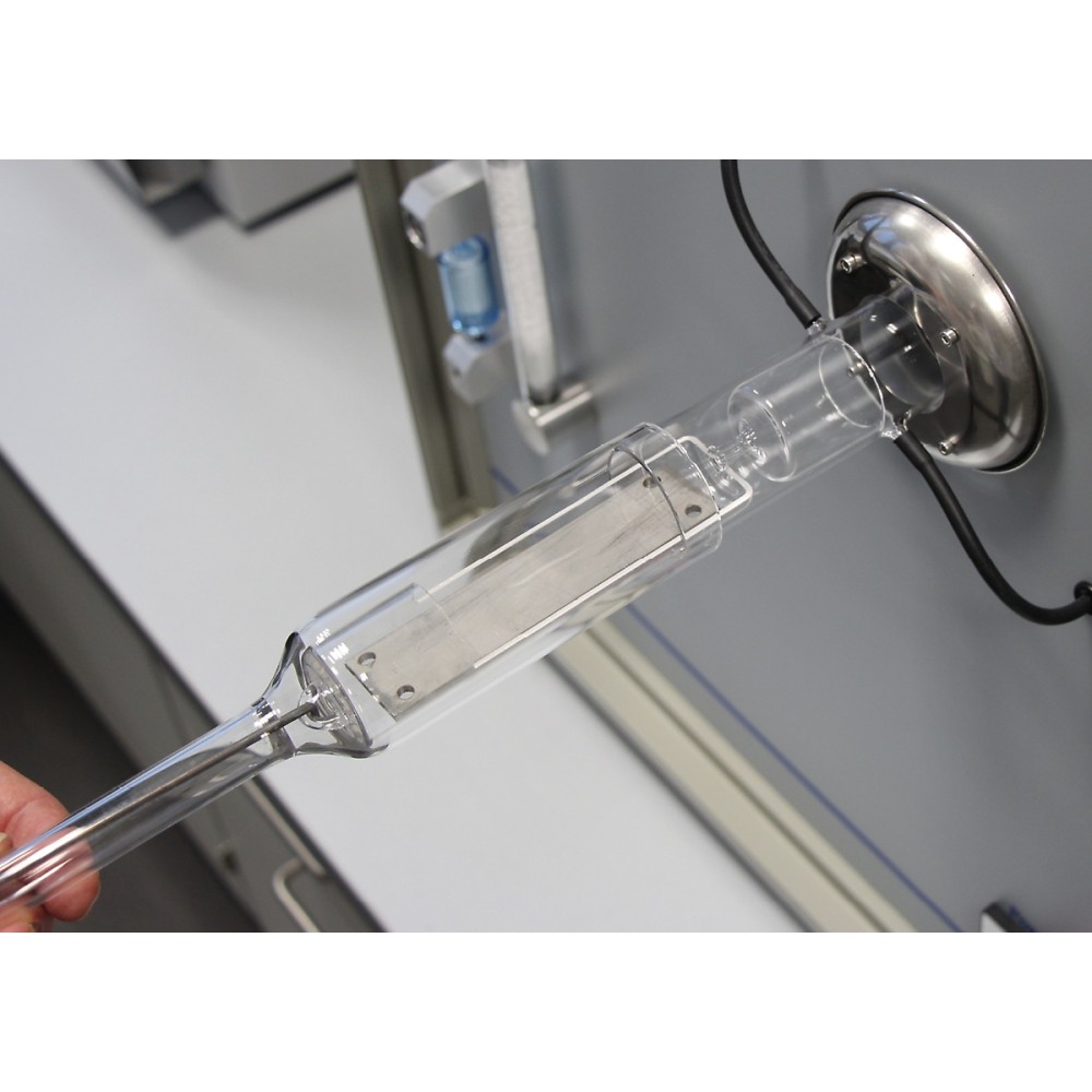 - Подготовка образца — проба укладывается в кварцевую лодочку. Пользователь вводит в программное обеспечение геометрические параметры образца (до 32 × 145 мм).