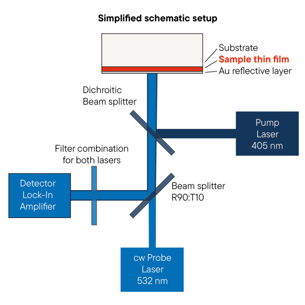 Прибор TF-LFA L54 использует метод частотной терморефлектометрии (FDTR) — современный бесконтактный оптический метод, позволяющий измерять тепловые свойства тонких пленок с высокой точностью и разрешением. В основе метода лежит модуляция мощности нагревающего лазера (pump laser) и измерение фазового сдвига отраженного зондирующего лазера (probe laser), что позволяет определить температурную реакцию поверхности образца.