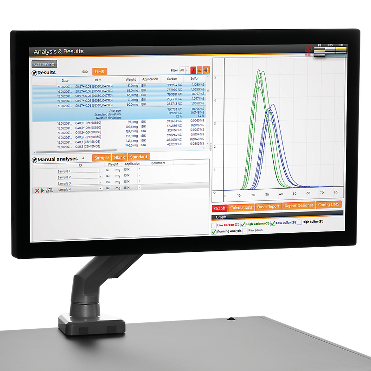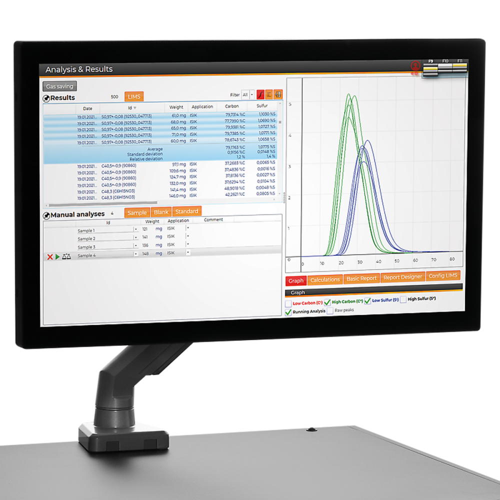 Закрытие печи во время анализа — опционально, но повышает воспроизводимость результатов. Весь процесс контролируется программой ELEMENTS, которая в реальном времени отображает кинетику горения и фиксирует результаты.