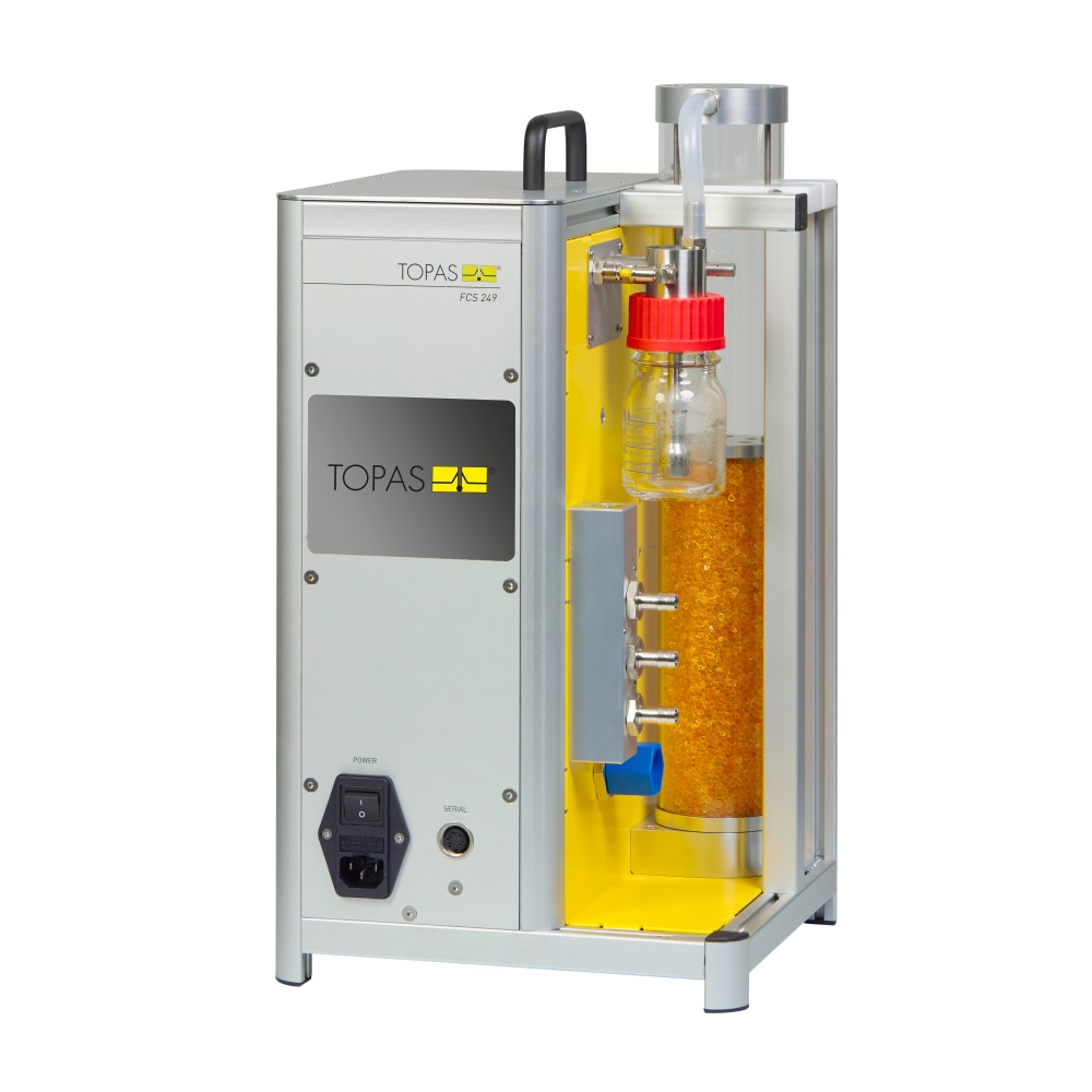 FCS 249 представляет собой комбинацию генератора аэрозоля, генератора объемного потока, осушителя и распределителя. Схематическое изображение принципа действия. При генерировании тестовых аэрозолей из водных растворов сначала создается капельный аэрозоль через двухкомпонентную форсунку. Затем он проходит через сухую атмосферу, которая удаляет влагу из текущего аэрозоля путем диффузии. В случае растворов солей это обеспечивает ненарушенную гомогенную кристаллизацию, что приводит к образованию компактных, полностью высушенных частиц соли.
