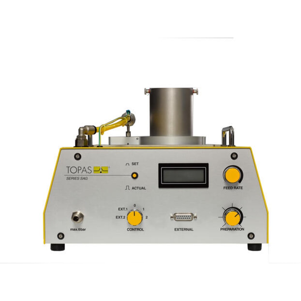 Генераторы пыли SAG 410/U или SAG 410/P подходят для использования с плохо текучими системами материалов, такими как Pural NF, для создания аэрозолей. Твердые частицы подаются сюда с помощью шнека и дозирующего кольца. Если используемое твердое вещество также имеет тенденцию прилипать к поверхностям, использование специальной насадки (P-сопло) обеспечивает всасывание твердого вещества из дозирующего кольца.
