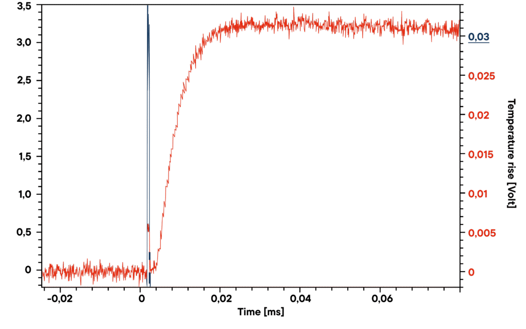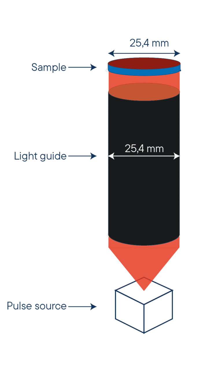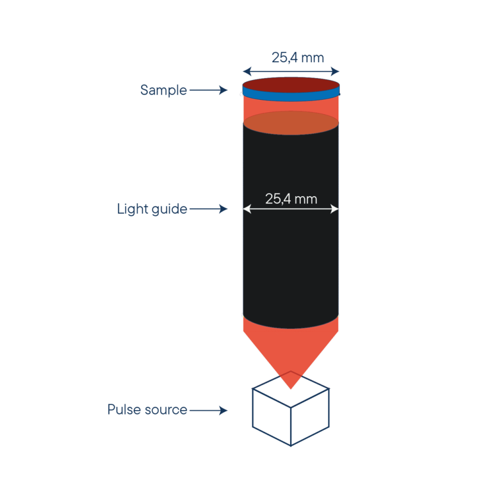 Метод вспышки (Light Flash Analysis) — это абсолютный, неразрушающий метод измерения теплодиффузии, который соответствует международным стандартам ASTM E-1461, DIN EN 821-2 и DIN 30905. В процессе измерения задняя сторона образца облучается коротким импульсом света (ксеноновая лампа), вызывая мгновенный нагрев. На передней стороне образца высокочувствительный инфракрасный детектор фиксирует рост температуры во времени. На основе полученной кривой и толщины образца рассчитывается коэффициент теплодиффузии α. При известных значениях плотности (ρ) и удельной теплоемкости (Cp) вычисляется теплопроводность по формуле: λ(T) = α(T) · Cp(T) · ρ(T).