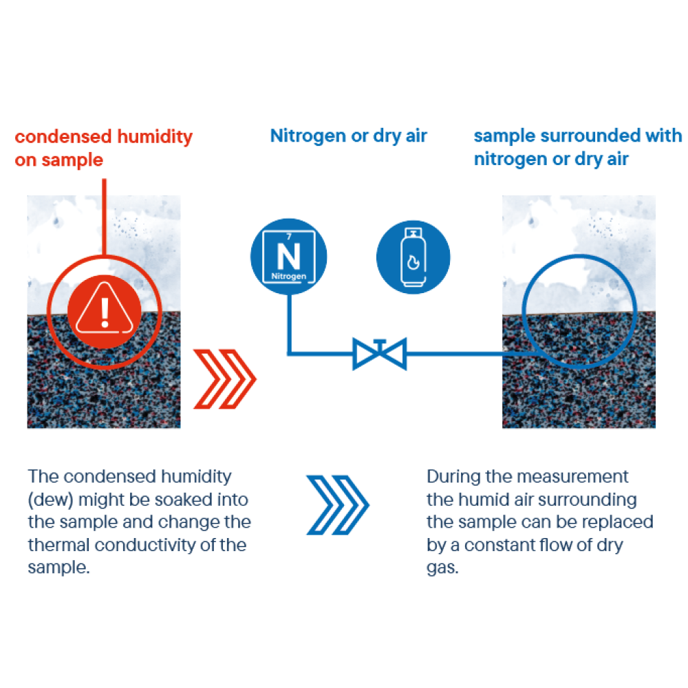 Одной из серьёзных проблем при измерении теплопроводности при низких температурах является образование конденсата на образце, который может впитываться в пористые материалы и искажать результаты. LINSEIS HFM L57 оснащён встроенной системой защиты от росы, которая позволяет подавать поток сухого воздуха или азота вокруг образца. Это исключает влияние влажности и обеспечивает высокую воспроизводимость и достоверность данных, особенно при работе с пенополиуретанами, минеральной ватой и другими гигроскопичными материалами.