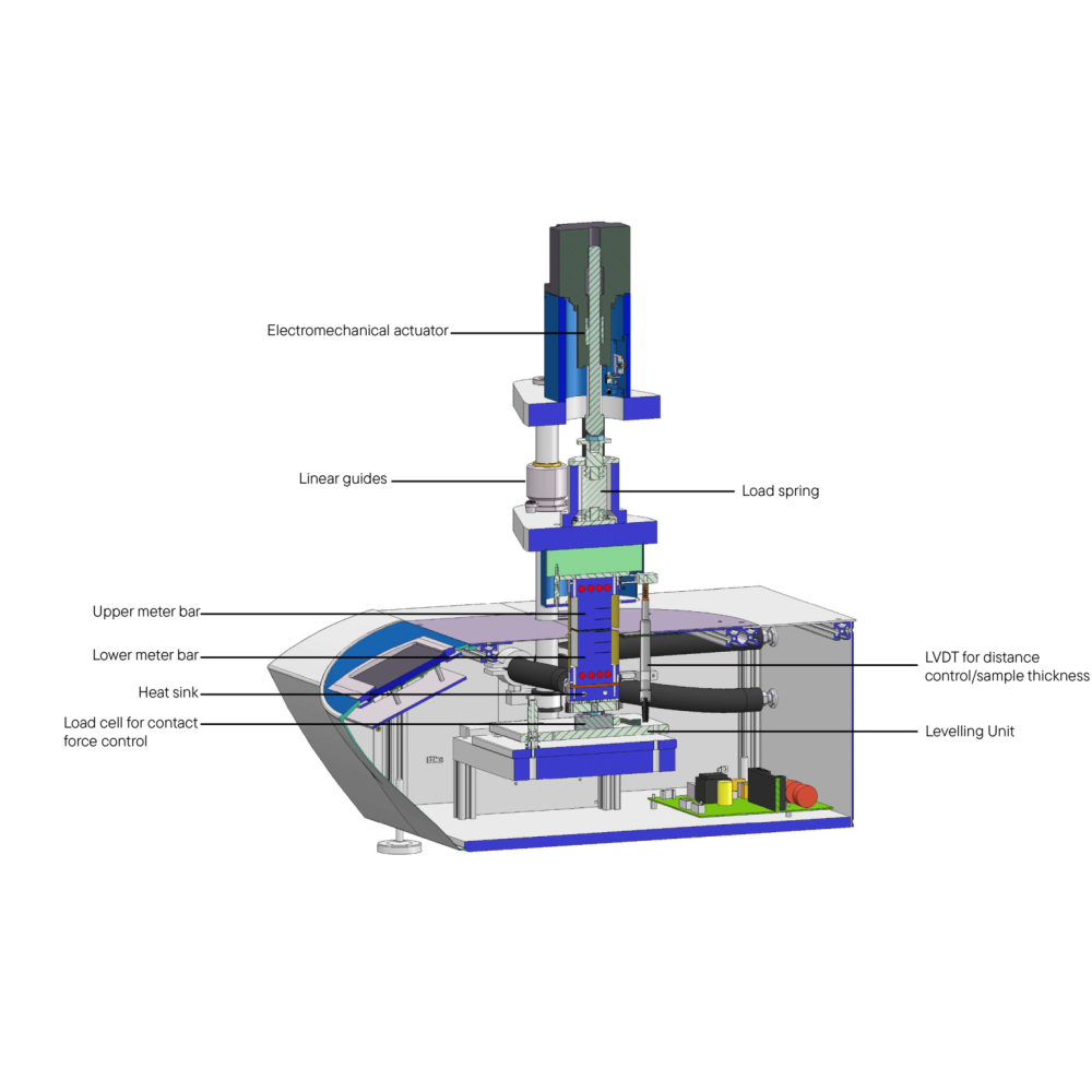 Контактное давление на образец автоматически регулируется с помощью электромеханического привода, что обеспечивает стабильность нагрузки в широком температурном диапазоне. Толщина образца может быть задана вручную или точно измерена с помощью встроенного датчика линейного перемещения (LVDT) с разрешением до 1 мкм. Тепловой поток определяется по градиенту температуры, измеренному с помощью нескольких датчиков, расположенных на известном расстоянии внутри стержней. На основе этих данных рассчитывается тепловое сопротивление и эффективная (кажущаяся) теплопроводность материала.