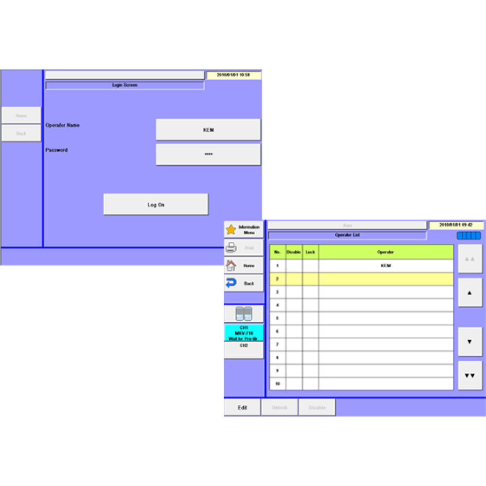 - Контроль доступа: каждый оператор авторизуется по уникальному ID и паролю. Поддерживается до 100 пользователей, при этом одновременно может быть авторизован только один оператор.