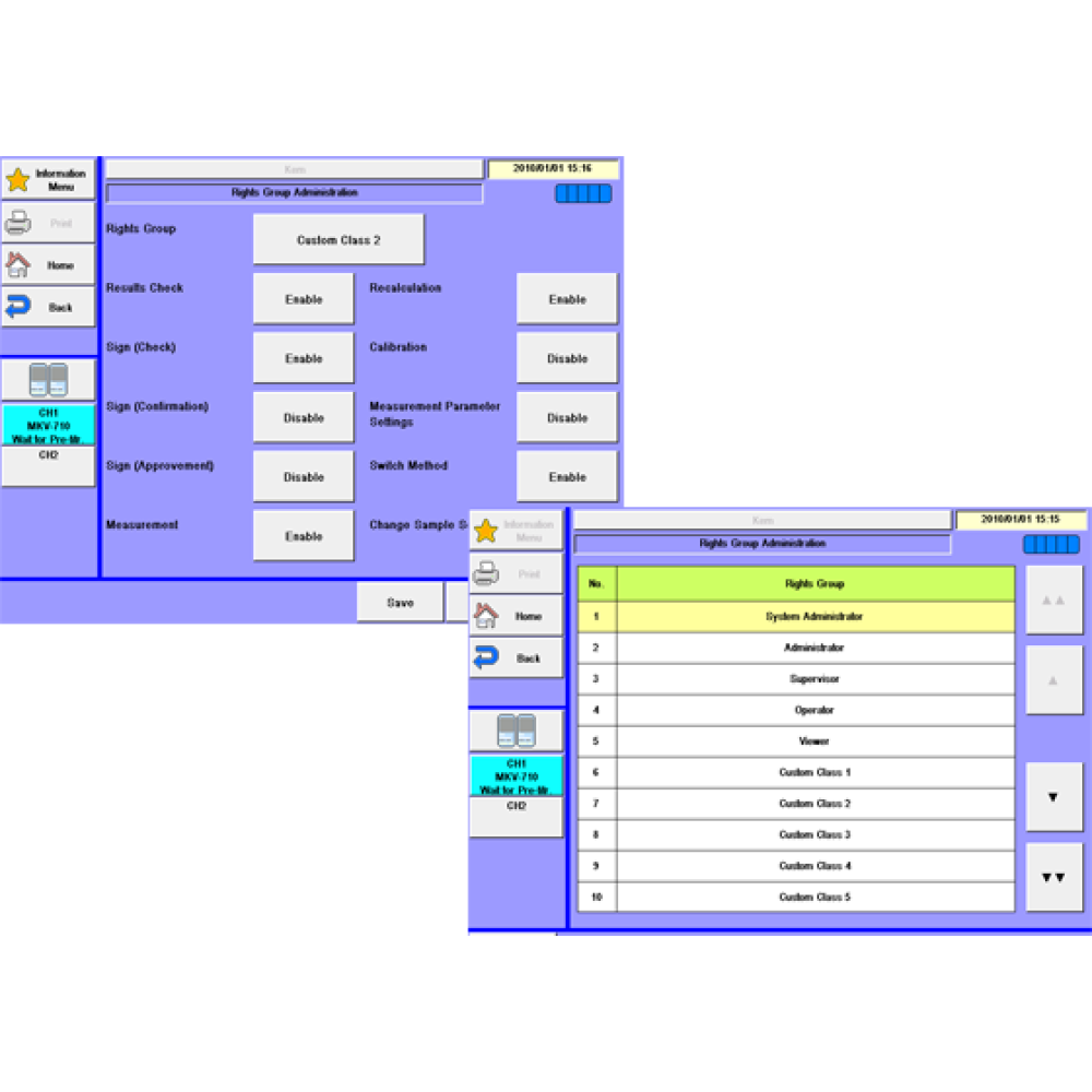 - Управление правами доступа: можно создавать до 10 пользовательских групп с различными уровнями доступа (редактирование методов, запуск измерений, подпись отчетов и т.д.), что позволяет гибко настроить систему под нужды конкретной лаборатории.
